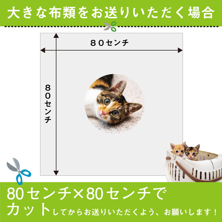 ※大きな布類については、50×50センチ前後で裁断してお送りいただくように長年お願いしておりましたが、動物たちのお世話の仕方の変更に伴い、今後は80×80センチ前後で裁断していただくようお願いいたします。すでに50×50センチ前後で布類を裁断してご寄付いただく準備をなさっておられましたら、その布類も大切に利用させていただきますので、お送りいただけますと幸いです(2025年8月21日追記)。